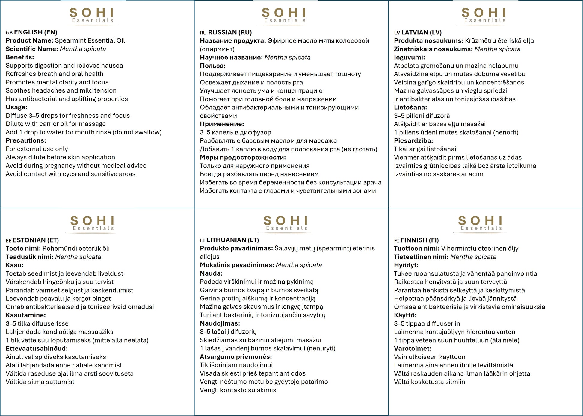 - Suunhoito: Sekoita yksi tippa lasilliseen lämmintä vettä ja käytä suuvetenä hengityksen raikastamiseen (vain jos öljy on tarkoitettu suun kautta käytettäväksi).